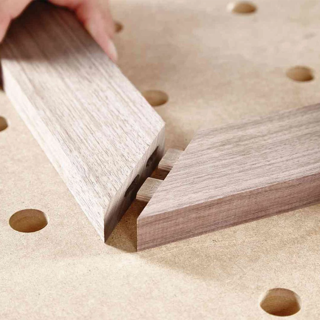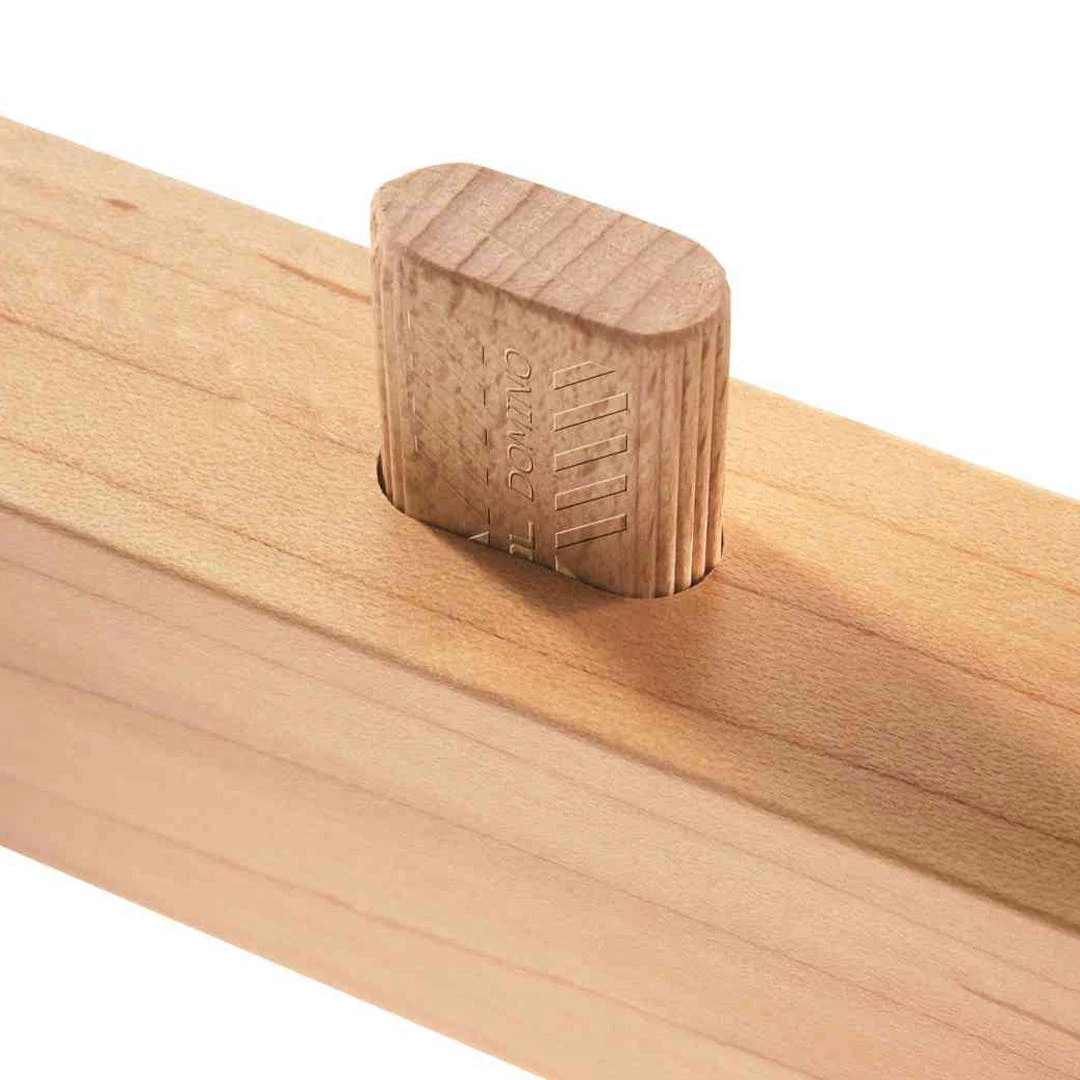 The special shape in combination with expanding glue pockets and longitudinal grooves gives the dowels a secure grip. For absolutely twist-proof connections and maximum stability. Added to this is significantly faster processing: The first dowel hole is aligned with extreme ease and routed accurately using flip stops. It immediately secures the workpieces that are to be joined so that they are exact and flush with the edge. The DOMINO system even tolerates smaller imprecisions in the other dowel holes.